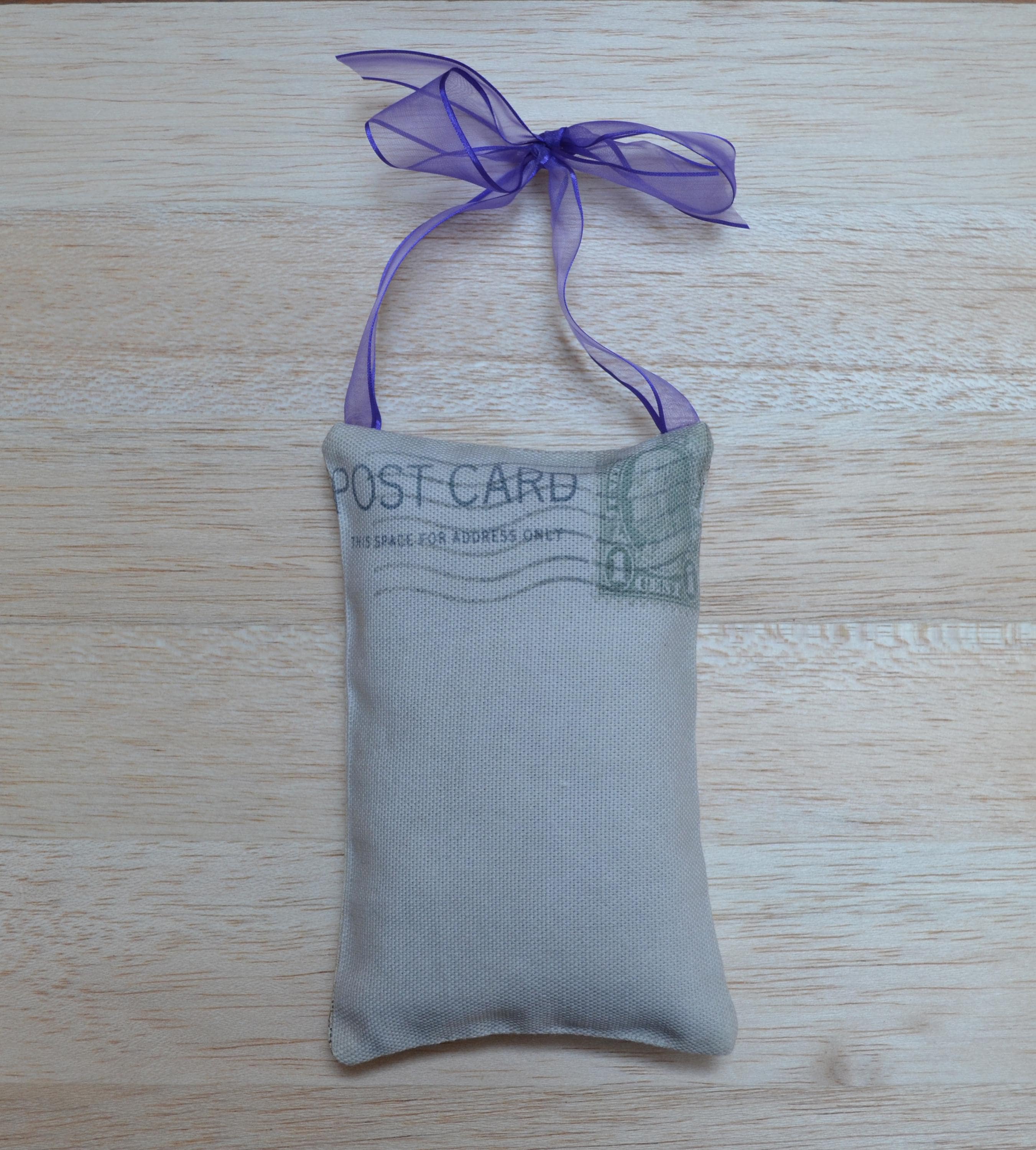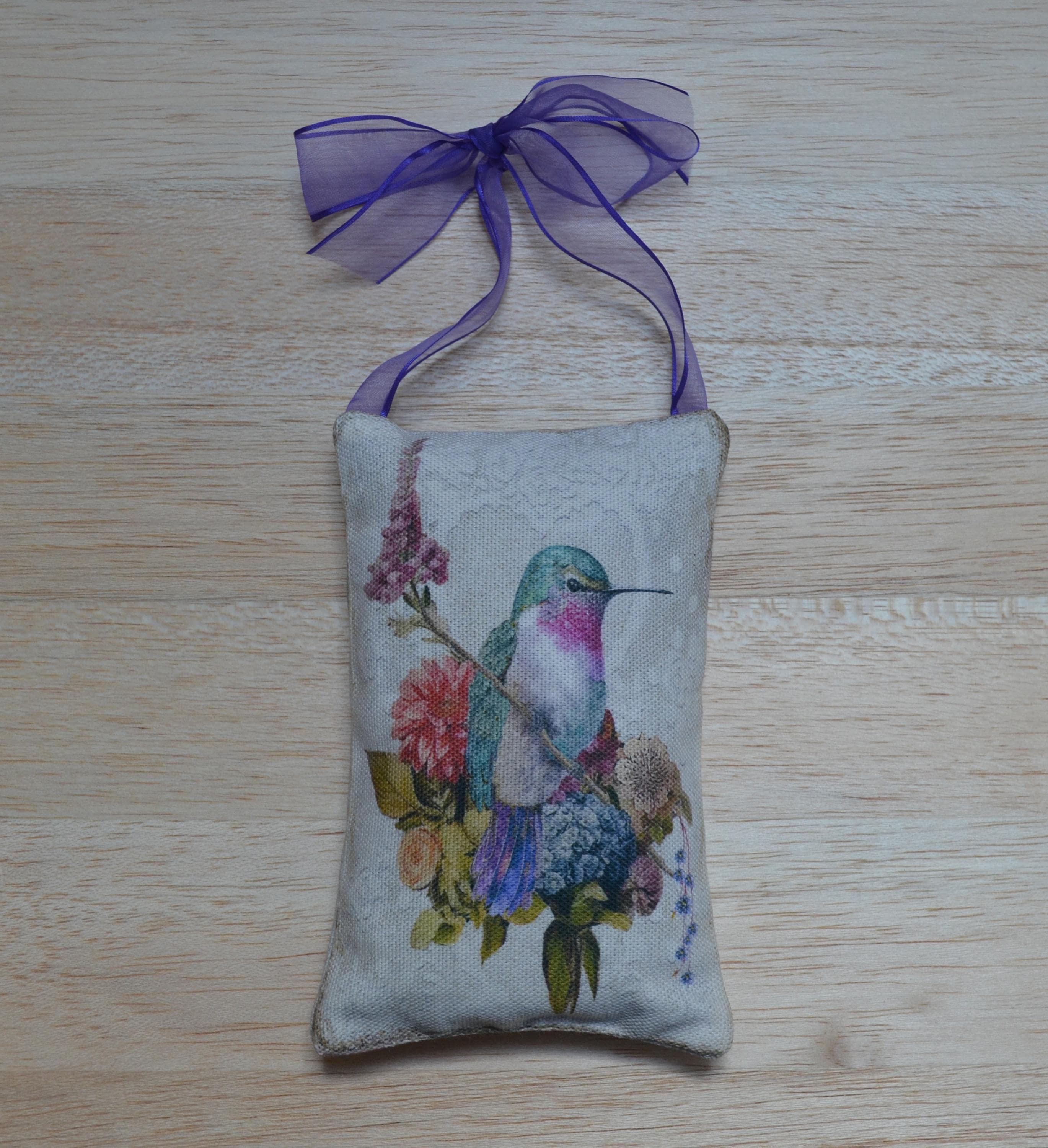 Hummingbird lavender sachet. I have hummingbirds in my garden so adding this sachet was a given! All of our lavender sachets are filled with 100% dried lavender flowers from France. The second photo shows the back of the sachet- the image is taken from one of my vintage postcards. The sachets measure approximately 6 inches long by 4 inches high before being filled. They are finished with a ribbon bow.
